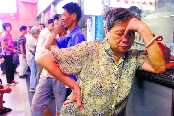 一位老太太在疲惫地排队看病