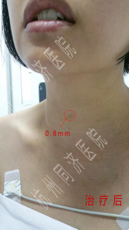 患者介绍:患者李苏(化名),女,32岁。无意中发现脖子左侧有些肿痛,去医院检查确诊为甲状腺结节早期,医生当时建议她采取手术治疗,她并没有采纳,当时选择了西药治疗;由于没有得到足够的重视,几个月后病情越发严重,肿块约鹌鹑蛋大小,随吞咽上下移动,偶尔出现恶心、呕吐的不适症状,经医生朋友介绍,来到杭州同济医院甲状腺就诊!