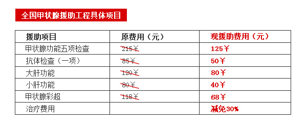 为了呼吁群众“关注甲状腺疾病,关爱下一代健康”,响应政府和谐社会号召,杭州同济医院科将开展全国甲状腺援助工程,减免优惠多项甲状腺检查、治疗费用,全力帮助更多甲状腺病患者,让他们不再为治疗费用发愁,以更低的价格接受最好的治疗,从而早日康复。