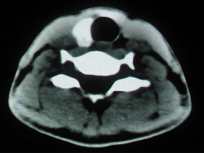 2.中期症状:形成结节,两侧出现不对称,结节表面平滑,质地较硬,吞咽时结节会上下滚动。