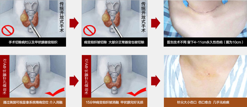 在不损害相邻器官和腺体组织的前提下进行超微介入,无需开刀,轻松去除甲状腺受损组织,窗口如针孔大小,几天后便会愈合,无需担心留下疤痕。