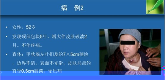 在2008年年底的时候,单位组织了一次体检,在我的体检报告上说发现我有甲状腺结节(单发)。由杨当时结节很小,对杨身体和外观都没有什么影响,所以我也就没有怎么重视,根本也就没有想着要去进行治疗。时间一天一天过去了,我的生活和工作也依然忙碌着,但是身体却开始有了很大的变化,感觉大不如前,经常会感觉到吞咽困难,当时误认为是咽喉炎,就到当地的医院进行了一段时间的治疗,可是没有任何的效果。2011 后在家人的催促下,我去了市里医院做了一个全面的检查,也就是在那个时候我被确诊为“甲状腺结节”,当时的报告显示结节已经长有2公分了。可是我仍旧忍着,直到前不久,脖子好像溃烂了,才又去医院检查,才发现甲状腺左叶扪及约7*5cm硬块,边界不清,表面不光滑,皮肤局部约直径0.5cm破溃,无压痛。真是后悔不已!