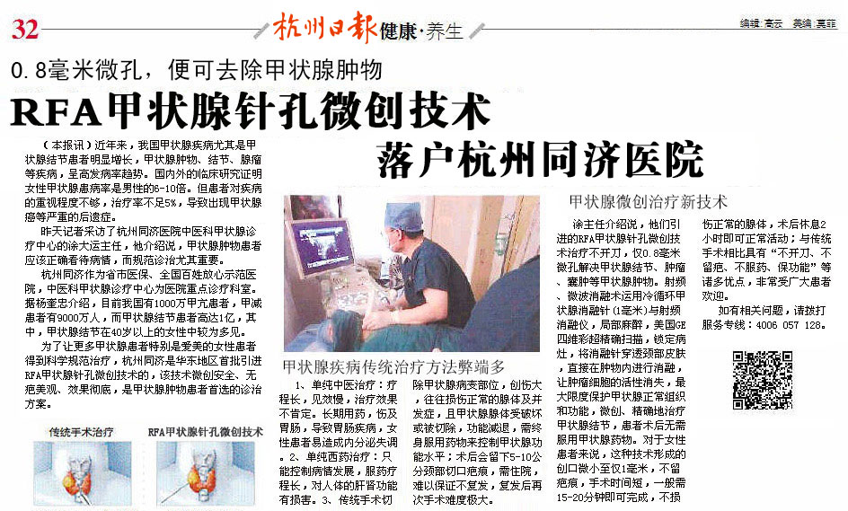 为了让更多甲状腺患者特别是爱美的女性患者得到科学规范治疗,杭州同济医院是华东地区首家引进RFA甲状腺针孔微创技术的,该技术微创安全、无疤美观、效果彻底,是甲状腺肿物患者首选的诊治方案。