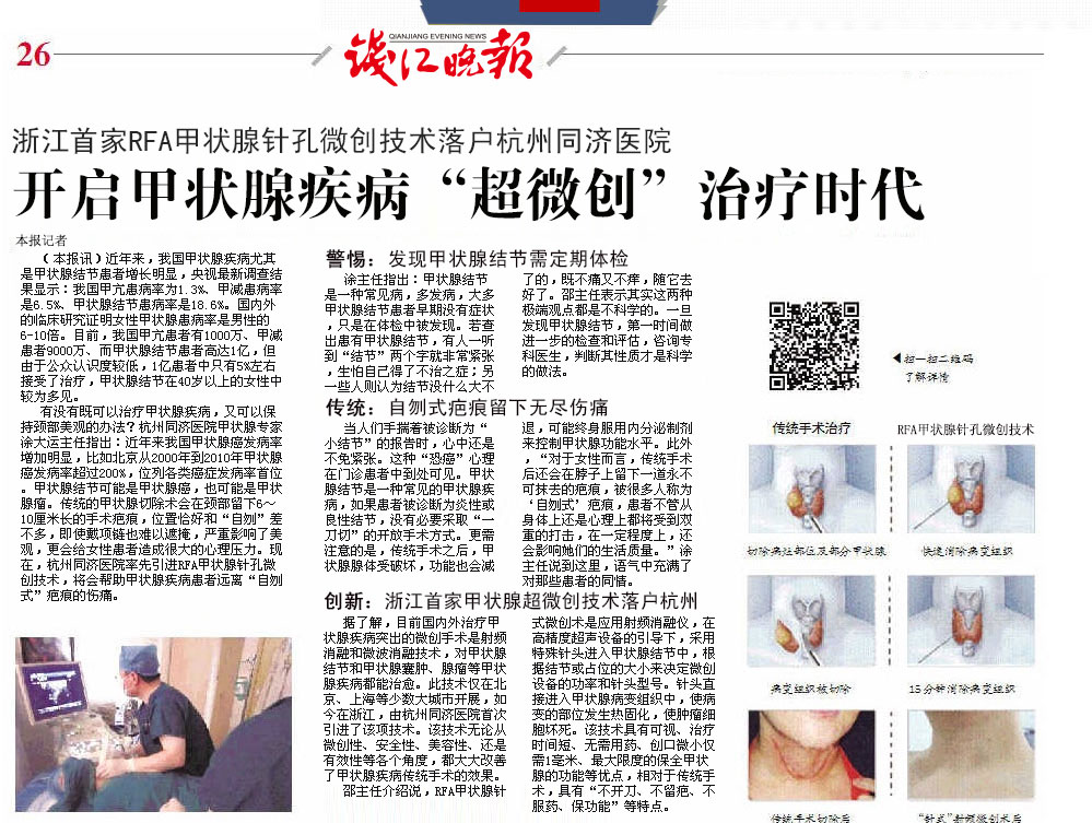 据了解,目前国内外治疗甲状腺疾病突出的微创手术是RFA甲状腺针孔微创技术,对甲状腺结节和甲状腺囊肿、腺瘤等甲状腺疾病都能治愈。此技术仅在北京、上海等少数大城市开展,如今在浙江,由杭州同济医院首次引进了该项技术。该技术无论从微创性、安全性、美容性、还是有效性等各个角度,都大大改善了甲状腺疾病传统手术的效果。