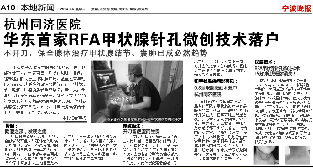 杭州同济医院是国家公立专科医院,甲状腺诊疗中心是医院的重点科室,引进RFA甲状腺针孔微创技术在华东地区尚属首家。该技术无论从微创性、安全性、美容性、还是有效性等哪个角度考虑都不失可以首选、信赖的诊治方案。伴随社会发展、医疗水平的不断提高,以超微创治愈甲状腺疾病不再是什么难题!此项技术的开展定会在我省甲状腺“超微创”治疗技术领域起到开拓性的发展,以惠及更多备受甲状腺疾病煎熬的患者朋友。